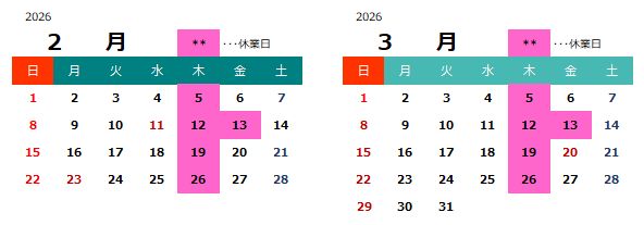 (注:木曜と第二金曜が祝日と重なった場合でも定休日としてお休みいたします)